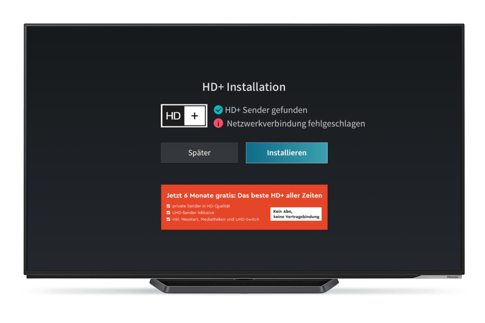 Sollte neben dem HD+ Logo eine Fehlermeldung wie „Netzwerkverbindung fehlgeschlagen“ erscheinen, wirst du bei der Installation automatisch zurück zu dem entsprechenden Installationsschritt geführt, um das Problem zu beheben.